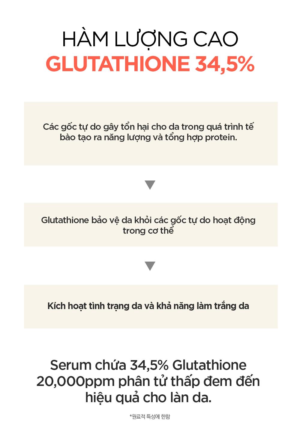 Serum Glutathione CELLBN với nồng độ cao 20.000ppm, giúp chống oxy hóa cực tốt, trung hòa các gốc tự do, ức chế sản xuất Melanin sẫm màu và cải thiện độ đàn hồi da, mang lại làn da trắng sáng và đều màu hơn. Sản phẩm mang lại hiệu quả trong thời gian ngắn, theo kiểm nghiệm lâm sàng thấy được rằng làn da thay đổi chỉ sau vài tuần sử dụng. Điểm lưu ý là sản phẩm có mùi đặc trưng của Glutathione, mùi sẽ hơi chua nồng, tuy nhiên CELLBN đi theo hướng tự nhiên, giữ nguyên đặc điểm thay vì dùng các hương liệu át mùi này để có thể mang lại hiệu quả dưỡng sáng và an toàn cho cả làn da nhạy cảm. Kết cấu serum mỏng nhẹ thấm nhanh vào da nên phù hợp cả da thường đến da dầu.
