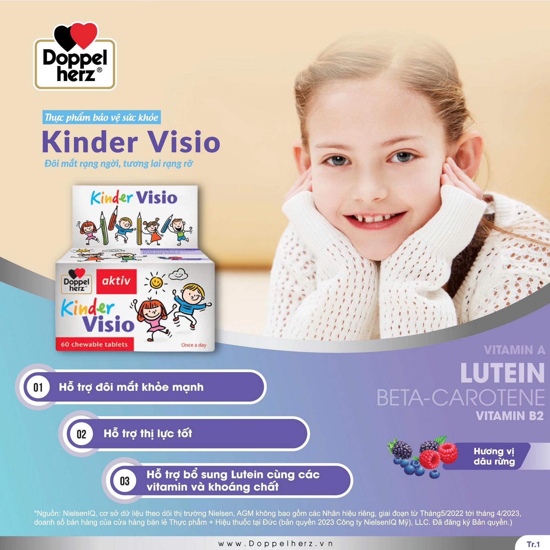 Thực phẩm bảo vệ sức khỏe Kinder Visio bổ sung vitamin A, E, B2, Lutein, Beta-Carotene, Kẽm hỗ trợ đôi mắt khỏe mạnh và hỗ trợ thị lực tốt