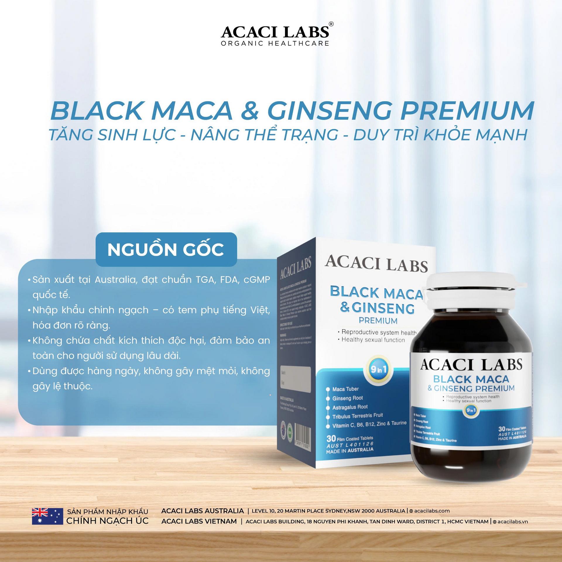1. Tên Sản phẩm : Viên uống bổ thận tăng cường sinh lý Acaci Labs Black Maca & Ginseng Premium Australia 30v