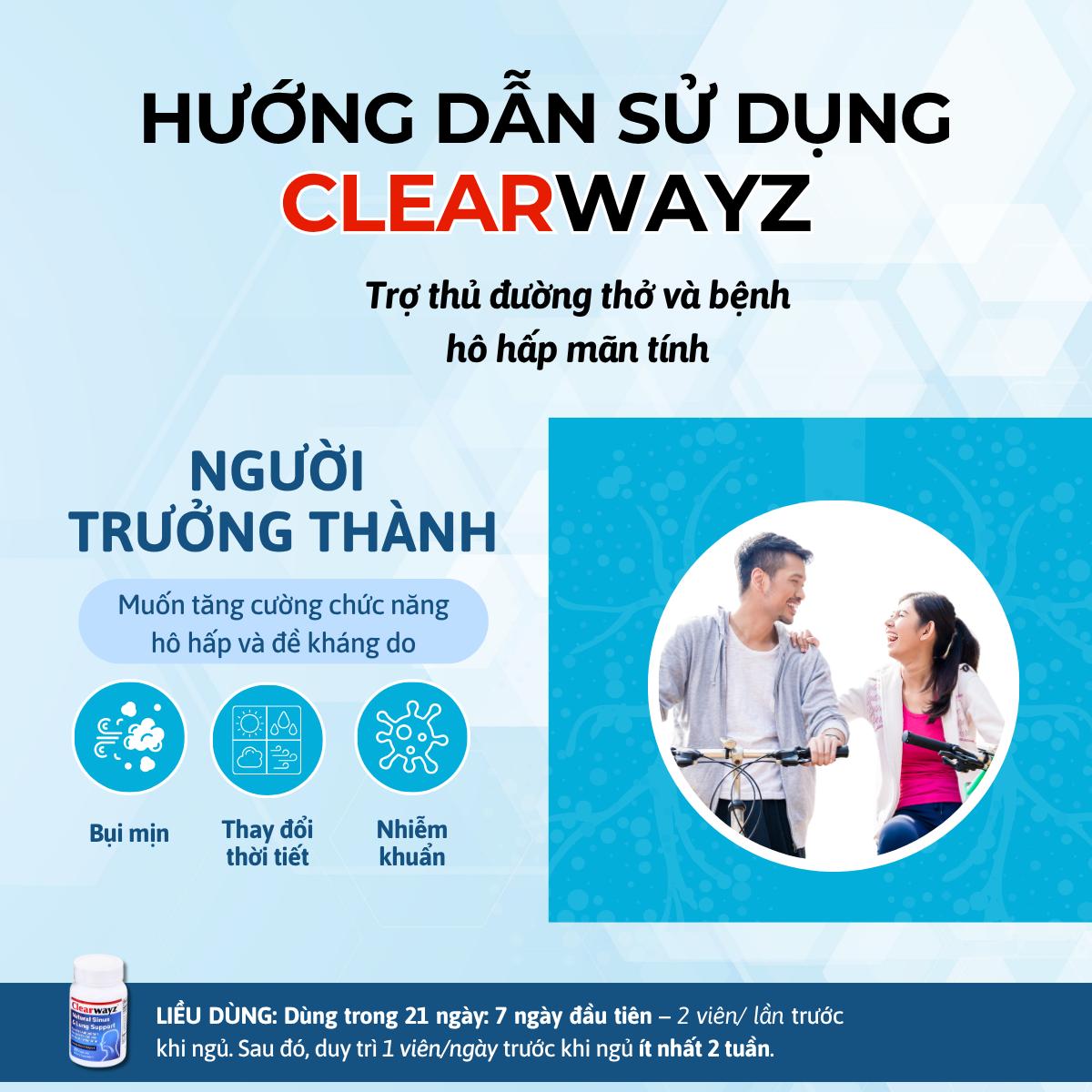 Clearwayz là thực phẩm bảo vệ sức khỏe đến từ Hoa Kỳ, được thiết kế đặc biệt để hỗ trợ tăng cường sức khỏe đường hô hấp một cách chủ động. Với công thức phối hợp nhiều dưỡng chất sinh học và chiết xuất thực vật chuẩn hóa, Clearwayz không chỉ giúp chống oxy hóa và tăng đề kháng.